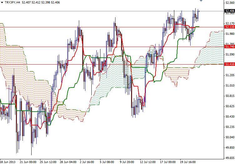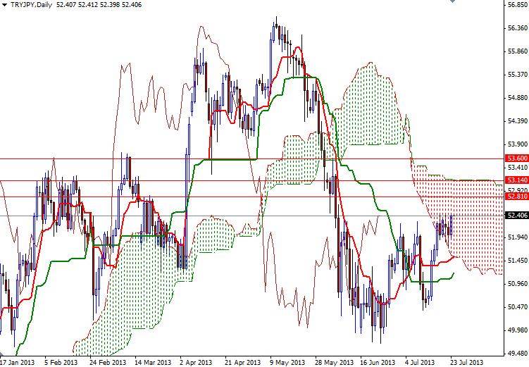 Dün gerçekleşen Para Politikası Kurulu toplantısında Türkiye Merkez Bankasının faiz koridorunun üst bansında artış yapma kararı alması Türk lirasının piyasa genelinde güçlenmesine neden olmaktadır. Türk lirasına olan talebin artış yaşaması son bir haftadır 51.74 ve 52.30 aralığında hapis kalan TRY/JPY (Türk lirası karşısında Japon yeni) paritesinin bir kırılma yaşamasına yardımcı olmuştur. Japonya Merkez Bankasının uzun vadede Japon yenini düşük seviyelerde tutmaya kararlı olması paritenin geçen ayın ortalarında 50.00 bölgesinde dip oluşturmasına yol açmıştı. 4-saatlik ve haftalık grafiklerde TRY/JPY paritesinin Ichimoku bulutu (dikey çizgilerin oluşturduğu alan) üzerinde hareket etmesi teknik olarak önemlidir ve yükseliş akımını desteklemektedir. Fakat günlük grafikte fiyatların Ichimoku bulutunun içerisinde olması paritenin bir süre daha yatay bir seyir izleyebileceği olasılığını gündeme getirmektedir.