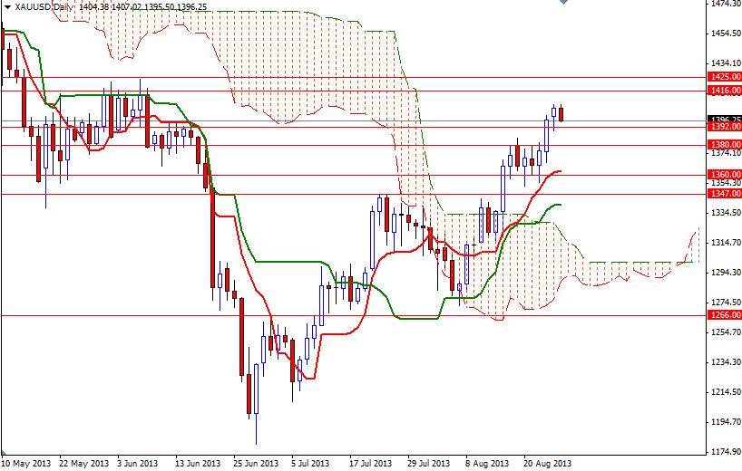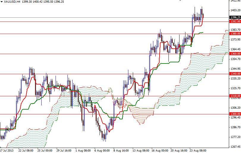 Gerek günlük gerekse 4-saatlik grafiklerde Ichimoku bulutlarının (dikey çizgilerin oluşturduğu alan) üzerinde olmamıza rağmen 1425 seviyesinde güçlü bir direnç ile karşılaşacağımızı düşünmekteyim. Bu seviyenin kırılması halinde ise -1455 seviyesine kadar- fiyatların hızını kesecek çok çetin bir engel bulunmamaktadır. Eğer ayılar dizginleri ellerine geçirir ve fiyatları 1392 desteği altına sarkıtabilirlerse, 1380 seviyesinin test edilmesi ihtimali güç kazanacaktır. Bu seviye bir önceki konsolidasyon bölgesinin üst sınırıdır. Bu sebepten dolayı, bu desteğin parçalanması halinde 1360 desteğinin test edilmesi teknik olarak mümkün hale gelecektir.