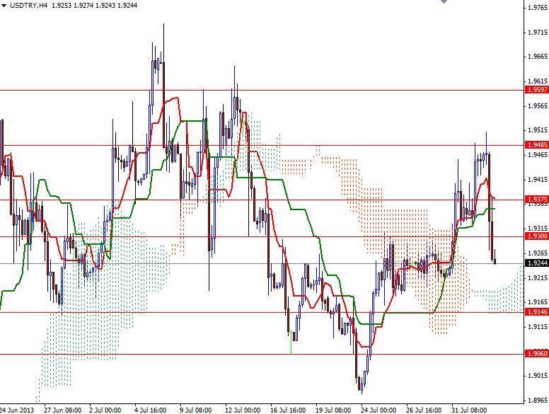 Açıklanan ekonomik verilerin önem taşıdığı yoğun bir haftayı oldukça hareketli geçirdiğimiz ortadadır. 1.9300 direncini kırarak 4-saatlik grafikte Ichimoku bulutunun (dikey çizgilerin oluşturduğu alan) üzerinde çıkmayı başaran USD/TRY paritesi 1.9485 direncine kadar tırmanabilmiş ancak bu seviyede tökezlemiştir. Cuma günü beklentilerin gerisinde gelen tarım dışı istihdam verileri paritenin yeniden 1.9300 seviyesinin altına inmesine yol açmıştır. Amerika Merkez Bankasının Eylül ayı ortasında gerçekleştireceği ve politikasını güncelleyeceği toplantısında niceliksel gevşemeyi azaltacağına dair olan bir inanışın hâkim olduğu bu ortamda istihdam sektörüne ait veriler (ve bölgesel Fed başkanlarının yorumları) hiç şüphesiz ki aşırı tepkilere neden olabilmektedir. Aslında Birleşik Devletlerden hafta içerisinde gelen verilerin geneline bakıldığında ortaya çıkan tablonun iyimserliğini koruduğu söylenebilir. Tabi bu piyasada önemli olan tablonun güzelliği değil, yatırımcıların o anki genel kanaatidir. Geçmiş tarihlere baktığımızda 1.9300 ve 1.9146 bölgesinin paritenin daha önce de konsolidasyon yaşadığı bir alan olduğunu görmekteyiz.