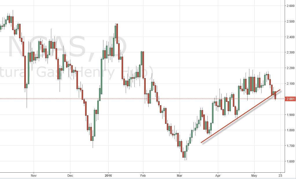 Doğalgaz piyasası Çarşamba günü içerisinde düşüş yaşamış ve 2 USD seviyesini test etmiştir. Burası psikolojik bir reaksiyon başlatma potansiyeline sahiptir fakat dünkü seansın işlem aralığının en düşük seviyelerine yakın bir yerde kapanmış olması aşağı yönde bir kırılmaya tanıklık edebileceğimizi düşünmeme yol açmaktadır. Eğer Çarşamba gününün en düşük değerinin gerisine sarkarsak 1.90 USD seviyesine doğru hareket etmememiz için hiçbir neden görmemekteyim. Neticede doğalgaz piaysası -son birkaç ay içerisinde gözlemlediğimiz hareketlere rağmen- halen uzun vadede düşüş akımı etkisindedir. Bu nedenden ötürü, satış gerçekleştirmeyi tercih ediyor olacağım. Kaldı ki, kısa vadeli yükselen çizgi de aşağı yönde kırılmıştır.