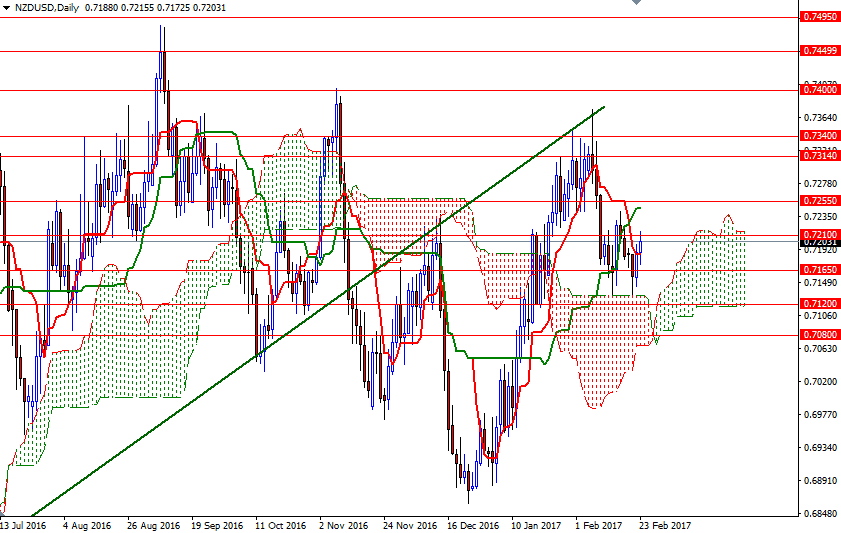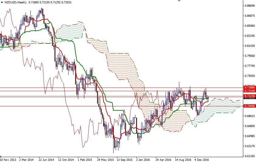 Fed Başkanı Yellen ve bazı bölgesel Fed başkanlarının son zamanlarda Mart ayında faiz artırımından bahsetmiş olmaları tutanaklardaki “oldukça yakın bir gelecekte” ifadesinin etkisini azaltmıştır. Günlük ve haftalık grafiklerde de görüldüğü üzere, NZD/USD paritesinin Ichimoku bulutları (dikey çizgilerin oluşturduğu alan) yukarısında ikamet etmesi boğalara bir avantaj sağlamaktadır.